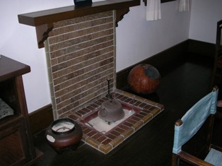 廊下を挟んだ反対側の部屋にはダイニングルームがありますが、市村家の希望で「西洋と日本の融合」の意味で茶釜が設置されています。