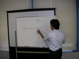 研修会の中でたまたま防水工事に関する話題が出たので防水に関しては本職の猿谷さん(第1回認定者)がスケッチを書いて解説しています。
